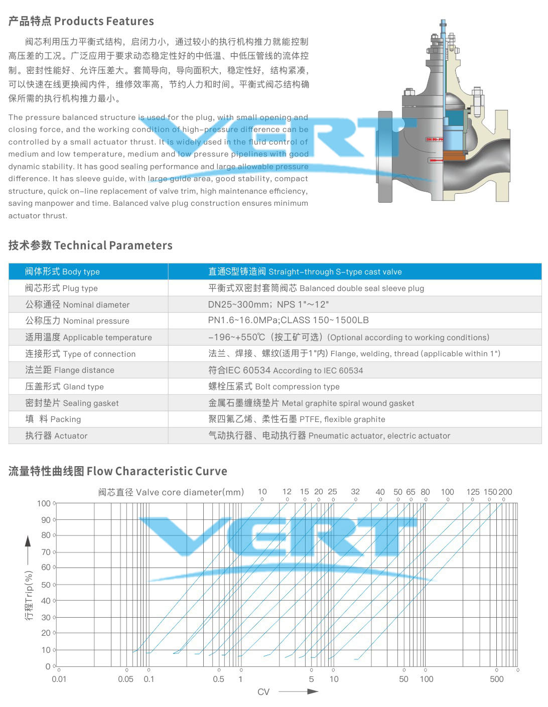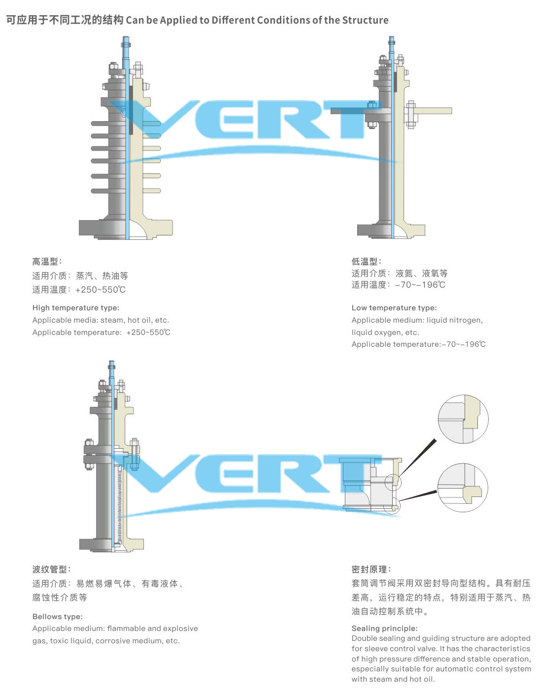The Company produces a series of double-sealed sleeve control valve, for which sleeve-guided and pressure-balanced plugs are adopted.The control valve of this series is a double-sealed sleeve structure, which is mainly used in occasions with low leakage requirements.Because both sealing surfaces of the double seal structure are metal seals, the temperature range for use is wider.