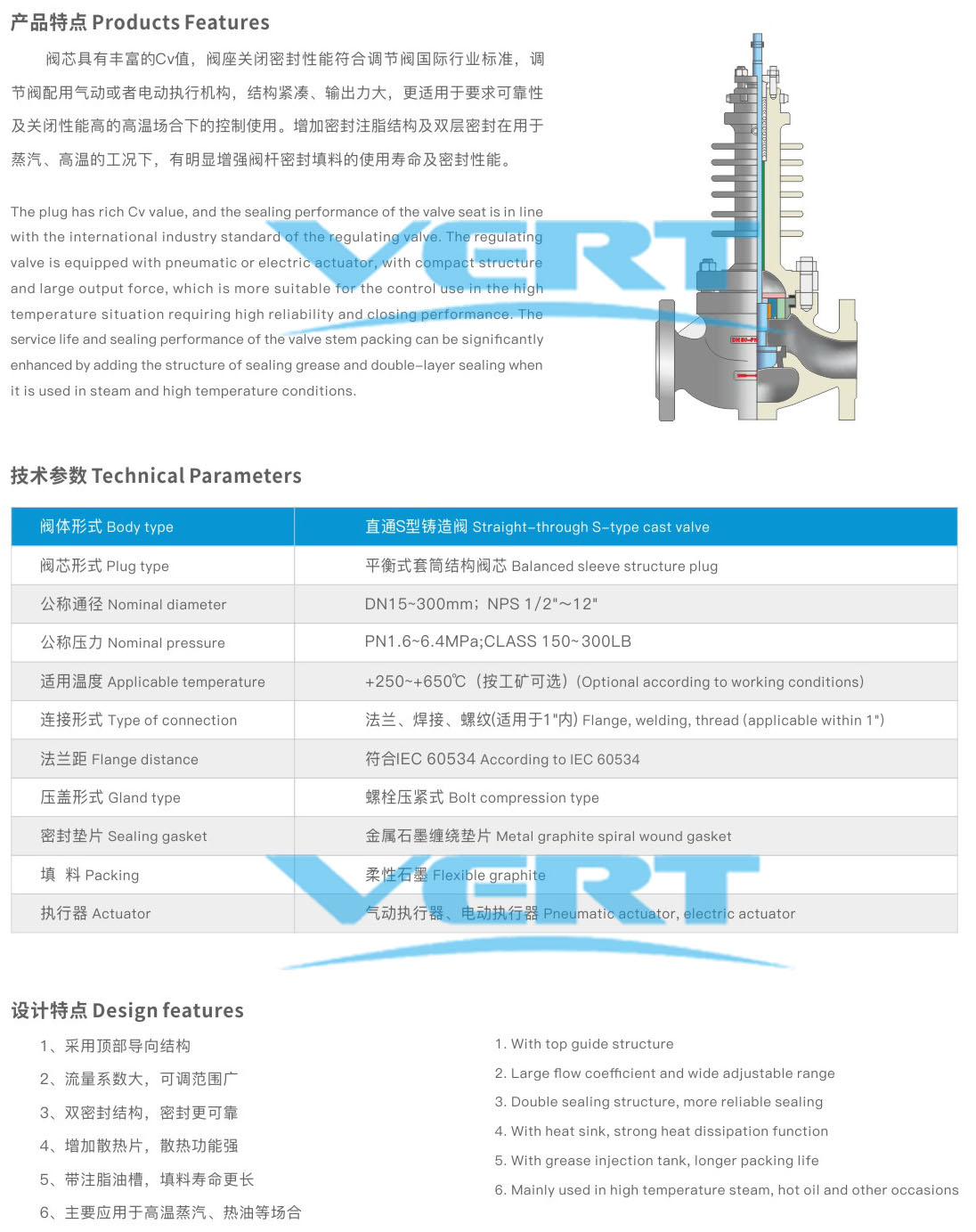 The series of high-temperature control valves of grease injection type produced by the company can be widely used to control various kinds of fluids with different pressures and temperatures.The valve body is compact and the flow channel isS-streamlined, with the characteristics of small pressure drop loss and large flux, wide adjustable range and high accuracy of flow characteristics.The balanced plug structure, adopted for the valve, has the advantages of good valve stability, low vibration, lownoise and low temperature sensitivity.It is widely used in occasions of large flow, high temperature, and leakage requirements not strict.